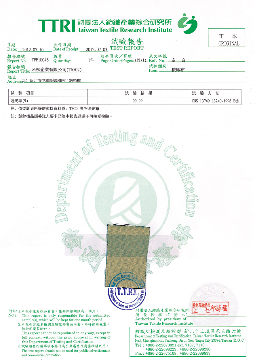 ◎本公司防火系列產品,皆為原紗防火織造並具遮光效果 ※採用本產品附環保標章產品證明書 |